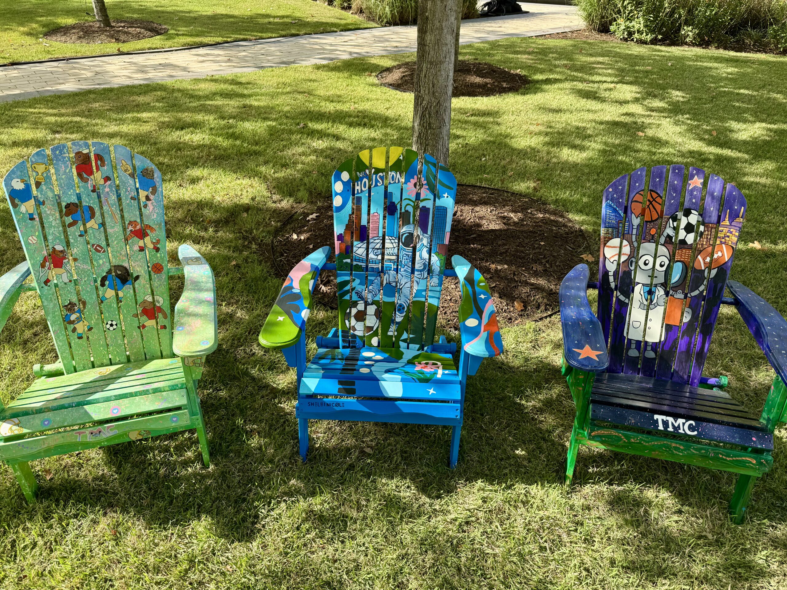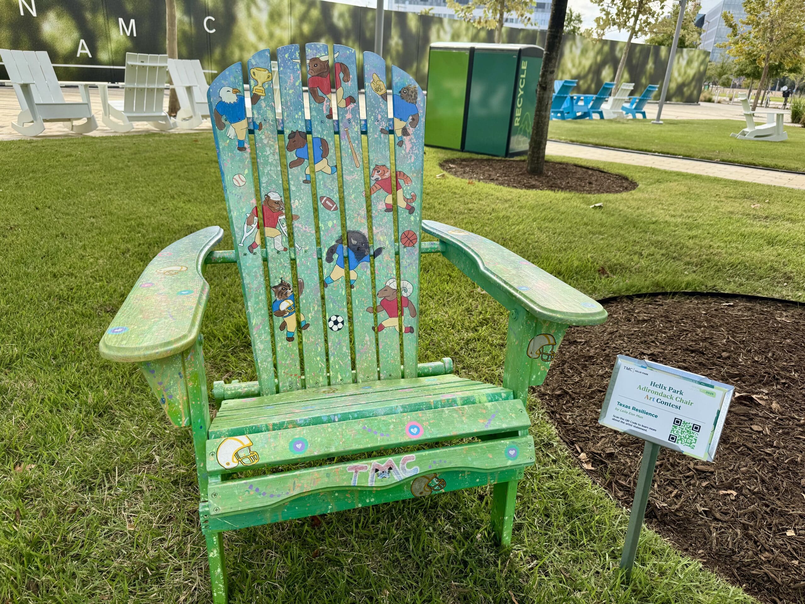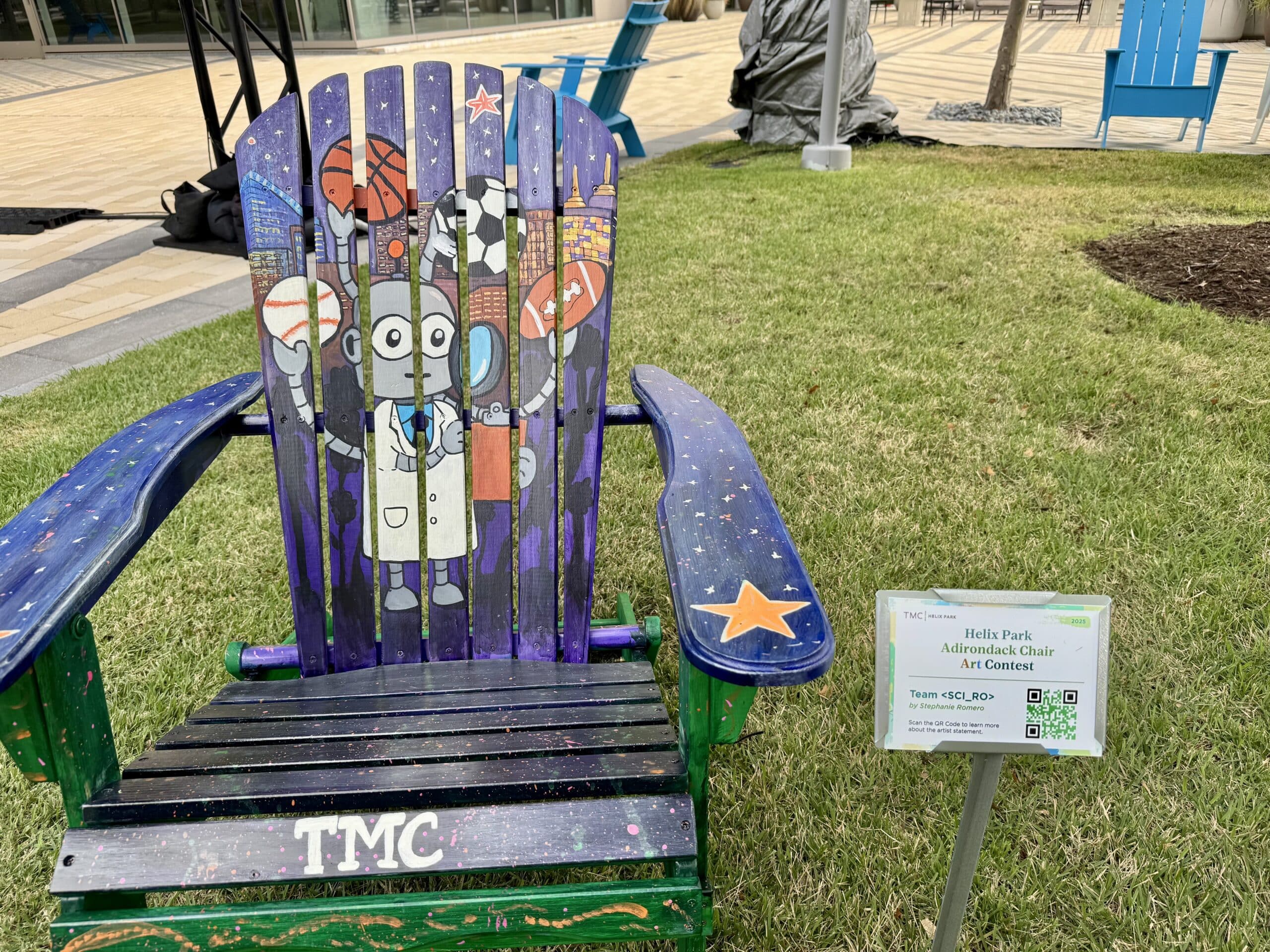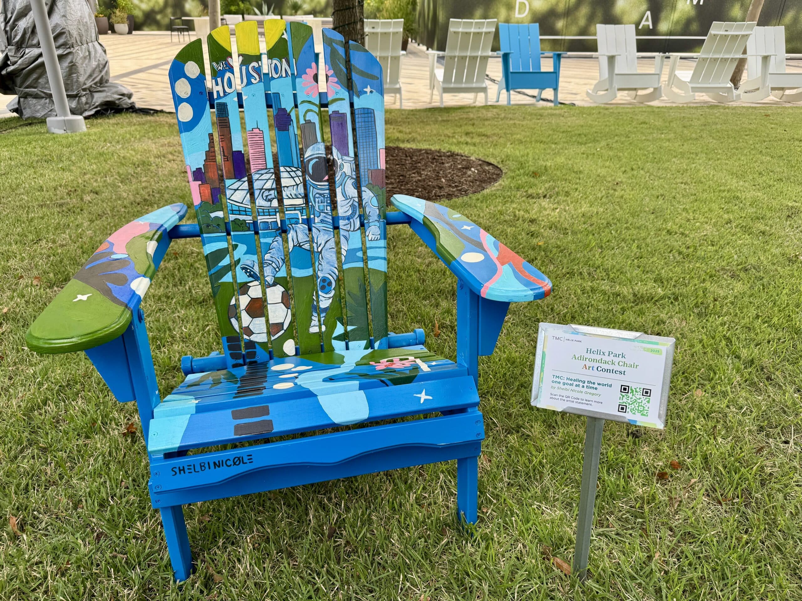The Helix Park Adirondack Chair Art Contest is a public art initiative that invites artists of all levels to transform Adirondack chairs into unique works of art. Now in its second year, the 2025 contest celebrated the theme “HOUSTON 2026: ACTIVATE THE WORLD CUP WITH TMC,” honoring Houston’s upcoming role as a FIFA 2026 host city.