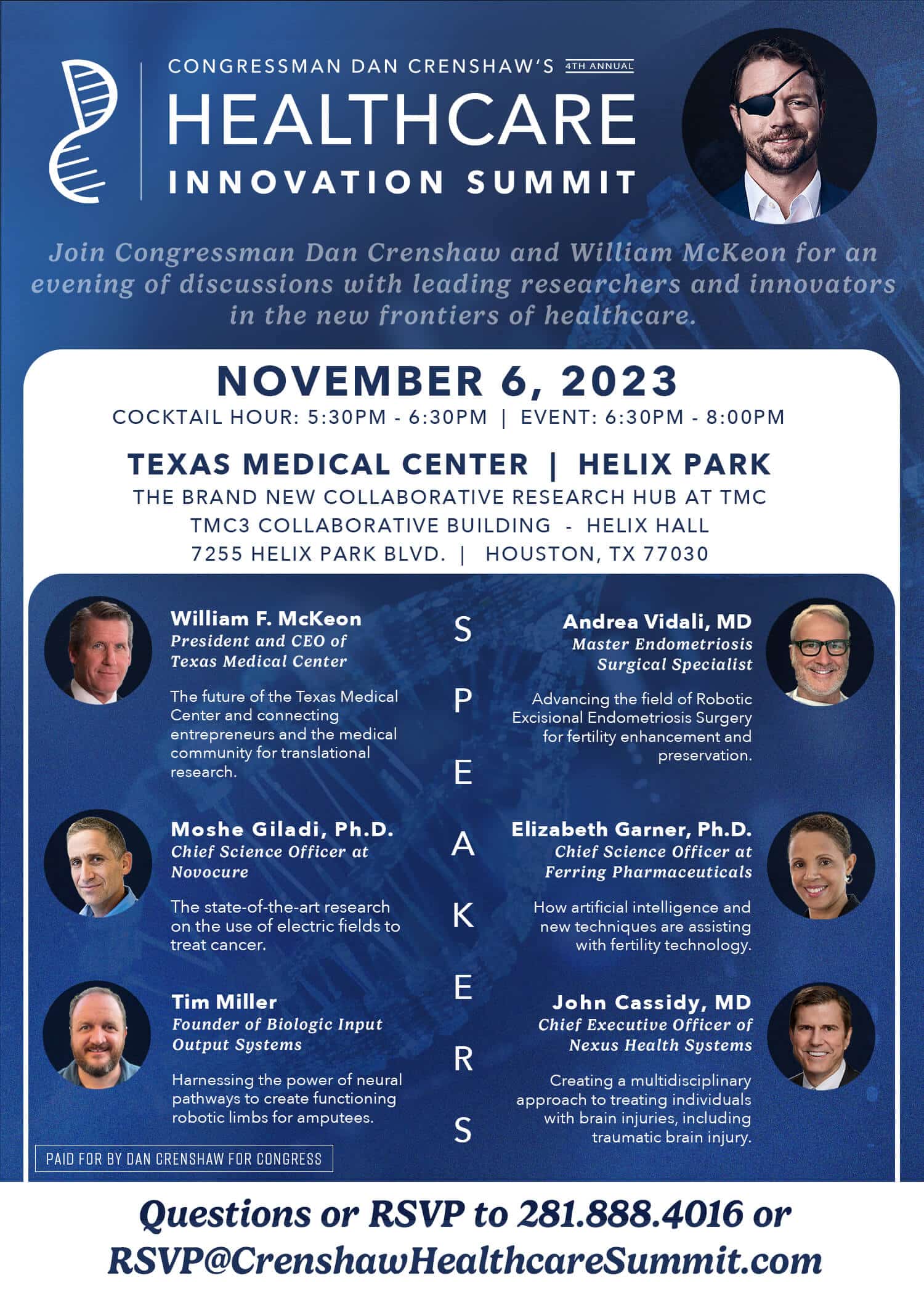TMC invites you to join Congressman Dan Crenshaw and William McKeon, President & CEO of TMC, for an evening of discussion with leading researchers and innovators. The event will be held at the TMC3 Collaborative Building at Helix Park on November 6 from 6:30 – 8 p.m. A digital invitation is attached with details.